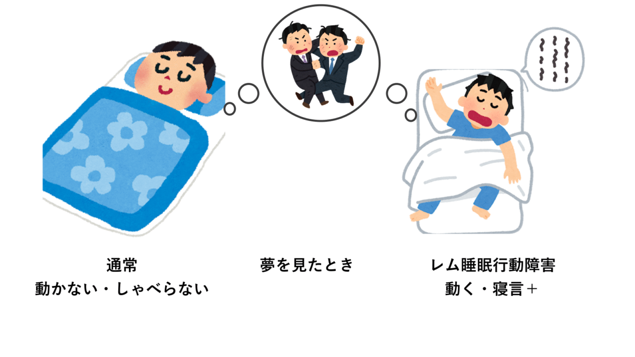 RBDは、夢を見ているレム睡眠期に、通常は麻痺して動かないはずの筋肉が活動してしまうことで、夢の内容と一致した行動をとってしまう病気です。